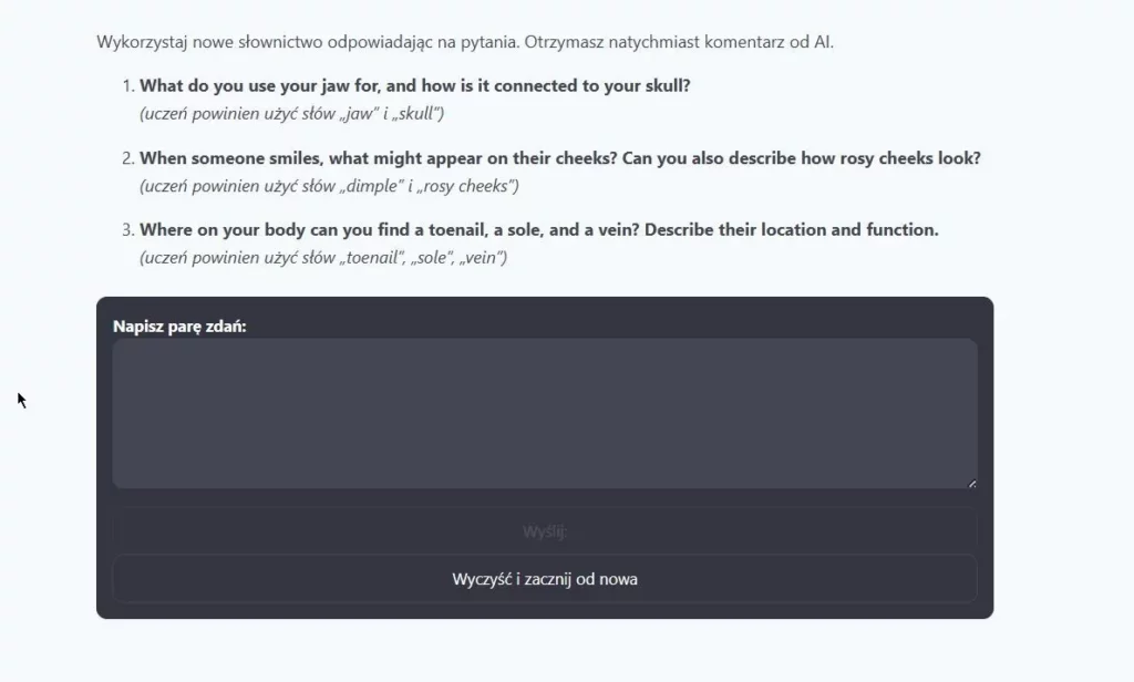 AI analizuje każde zdanie, dając komentarze dotyczące gramatyki, stylu i struktury wypowiedzi. W przypadku mówienia – ocenia wymowę, płynność i intonację, dając konkretne wskazówki poprawy.