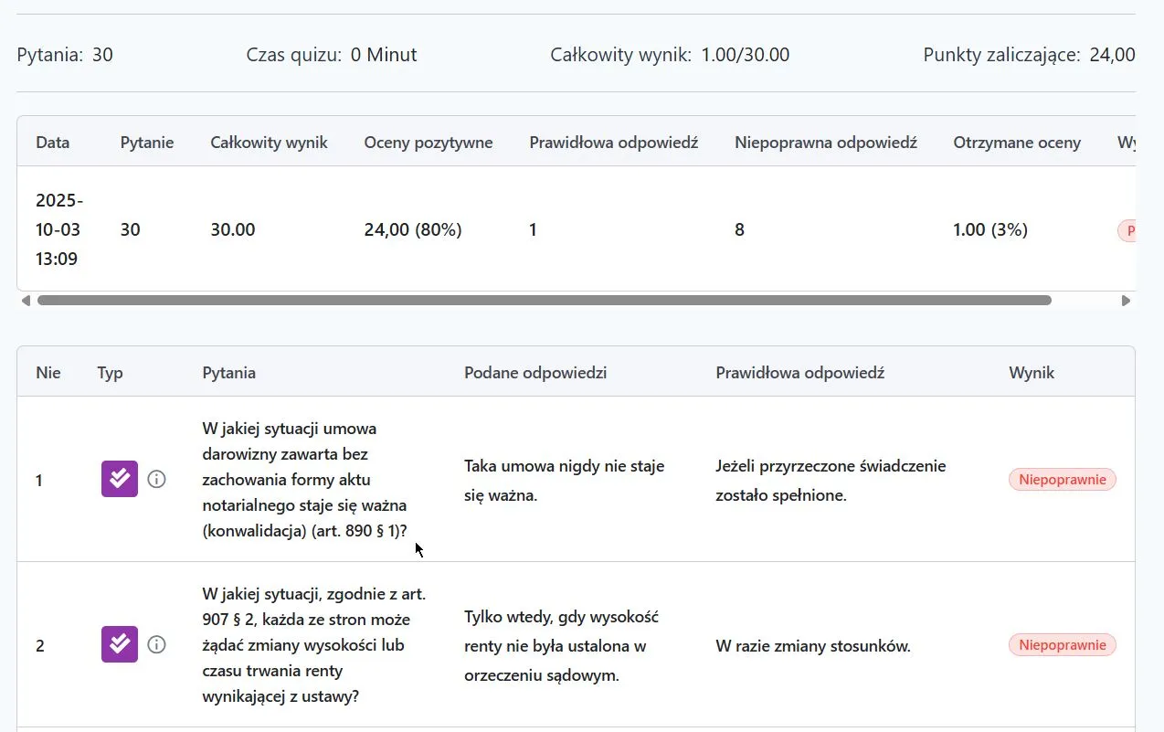 Podstawą kursu jest potężna baza testów z Kodeksu Cywilnego. Znajdziesz tu nie tylko pytania, lecz starannie przygotowane kazusy oraz zadania jednokrotnego wyboru, które odzwierciedlają realia egzaminów uniwersyteckich i państwowych.