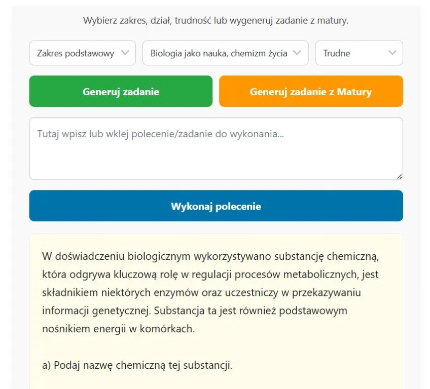 W tym module znajdziesz niewyczerpaną bazę zadań typu maturalnego. Nasz generator AI tworzy nieograniczoną liczbę zadań z genetyki (w tym krzyżówki genetyczne), metabolizmu (fotosynteza, oddychanie komórkowe), ewolucjonizmu czy anatomii człowieka. Możesz intensywnie ćwiczyć konkretne typy zadań, analizować schematy i wykresy, aż poczujesz pełną swobodę w rozwiązywaniu nawet najbardziej skomplikowanych problemów maturalnych.
