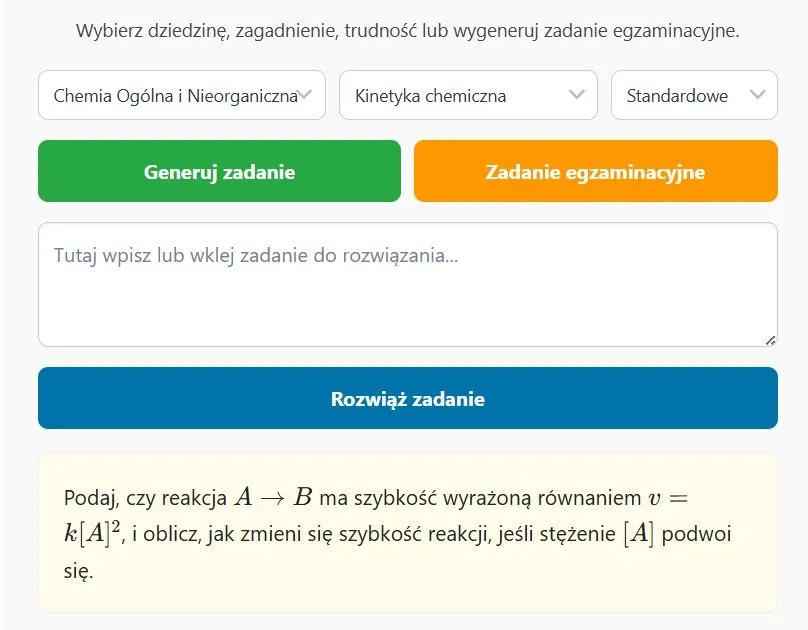 Potrzebujesz przećwiczyć obliczenia stechiometrii, równania reakcji redoks czy zadania z chemii organicznej? Nasz generator AI stworzy dla Ciebie nieograniczoną liczbę zadań na poziomie podstawowym i rozszerzonym, dopasowanych do wymagań maturalnych i egzaminów zawodowych. Każde zadanie otrzymasz z rozwiązaniem krok po kroku i komentarzem.