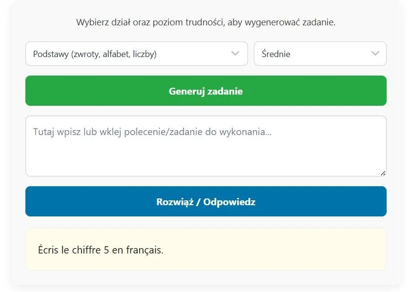W tym module nauka przypomina grę. Nasz generator AI tworzy niekończącą się liczbę quizów i interaktywnych zadań, które pomagają opanować podstawowe słownictwo, rodzajniki (le, la, un, une) oraz odmianę kluczowych czasowników (être, avoir, aller). Dzięki kolorowym ćwiczeniom i natychmiastowym wynikom dziecko chętnie utrwala wiedzę, a zapamiętywanie nowych słówek staje się łatwe i skuteczne.
