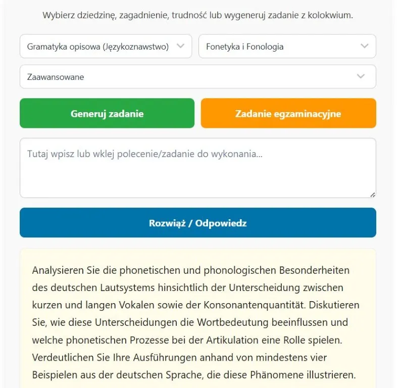W tym module znajdziesz zaawansowane zadania, które pozwolą Ci udoskonalić warsztat językowy. Nasz generator AI tworzy ćwiczenia ze złożonych struktur gramatycznych, takich jak strona bierna (Passiv), tryb przypuszczający (Konjunktiv II) czy nominalizacja. Możesz również intensywnie trenować słownictwo specjalistyczne (Fachwortschatz) z Twojej dziedziny studiów, od prawa i ekonomii po kierunki inżynierskie.