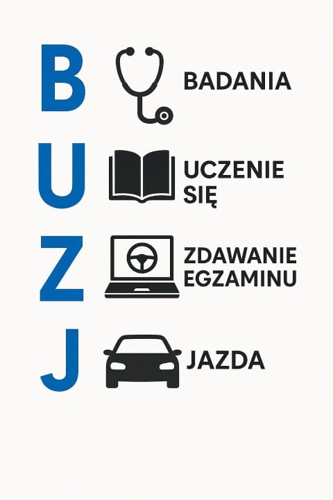 Mnemotechnika dla procedury uzyskania prawa jazdy: „Badasz-Uczysz się-Zdajesz-Jeździsz” (BUZJ) – B(adania) U(czenie się) Z(dawanie) J(azda).